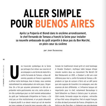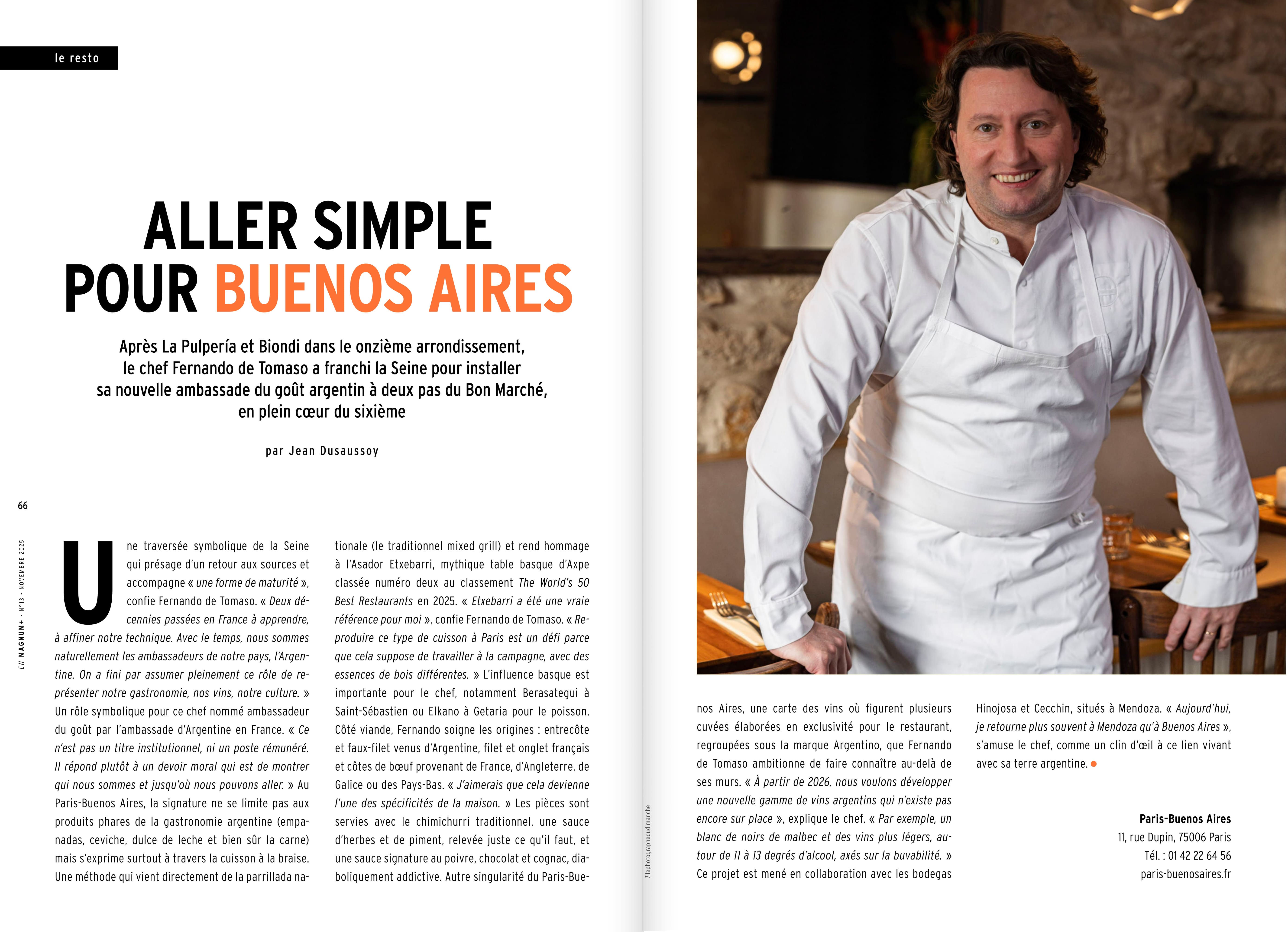 Le chef argentin Fernando de Tomaso ouvre une nouvelle adresse au cœur de Saint-Germain-des-Pré, Paris Buenos Aires. Ce restaurant entend créer un lien entre Paris et Buenos Aires à travers une cuisine au feu de bois et une identité culinaire mêlant précision française et générosité argentine.